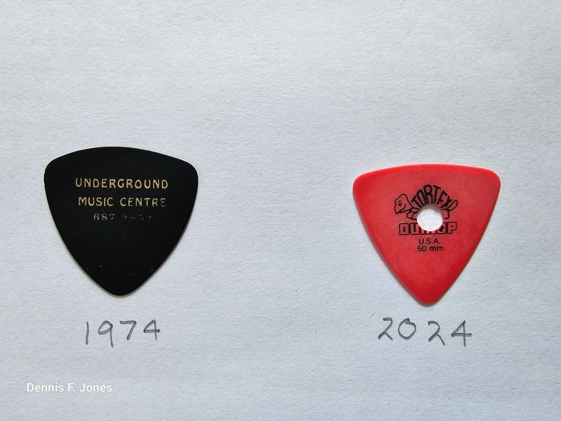 As you can see, I have been using large triangle picks for more than 50 years. I bought the one on the left from the Underground Music Centre in Petawawa, Ontario in 1974 when I was playing in a professional band. Of course, the plastic is so brittle now it would shatter the first strike on a string. The owners were my friends Marcel and the late Linda Bourque who ran the store for 21 years. We purchased a lot of band equipment from their store. I do miss them dearly!