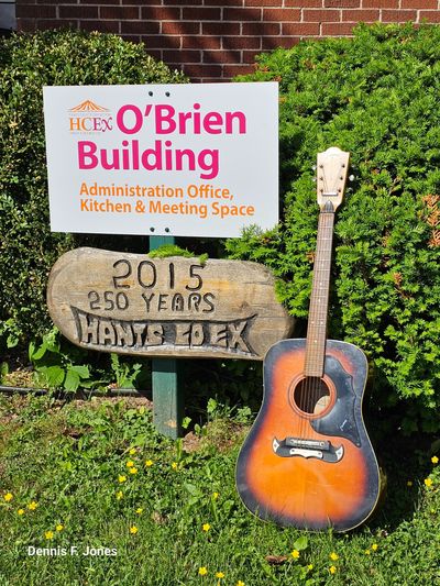 My current guitar is a Taylor Custom 414ce made in California. The shape of the neck and easy action make this an ideal match for my hands which have developed osteoarthritis in the joints since 2006. This guitar has seen lots of work over the years from Freeman's Little New York in Lower Sackville to the Hants County Exhibition in Windsor. The strings I use are Elixir Lights 12-53 for a great sound and long life. Most of my songs are performed with large, flexible triangle flat pics but I use finger style for a few songs. This year I bought a capo for the first time since the late 60s. Playing without a capo for over 55 years allowed me to develop strong fingers for barre chords, and the ability to play songs in any key. My playing style includes a lot of damping with both hands, and using pick rotation for staccato with the pick's points, and legato with the edges. To facilitate rotation and to prevent dropping my pick, I make a hole in the centre of the pick with a one-hole punch. It is rare that I drop a pick while playing.
